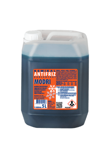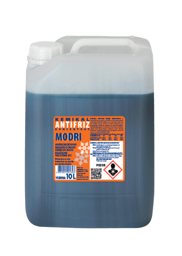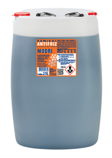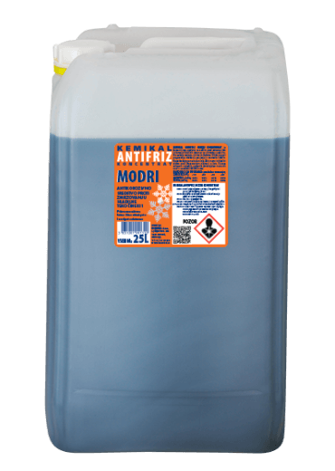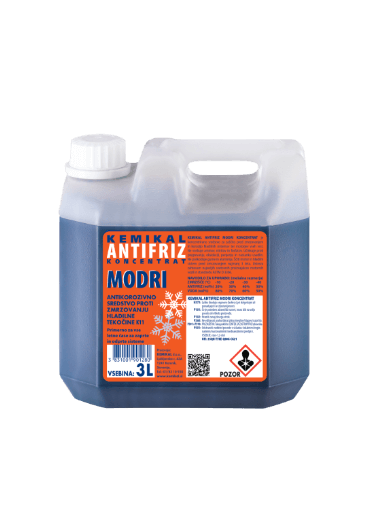 KEMIKAL ANTIFRIZ MODRI je koncentrirano sredstvo za zaščito pred zmrzovanjem in korozijo hladilnih sistemov ter motorjev vseh vrst. Ne vsebuje aminov, nitritov in fosfatov. Učinkuje proti pregrevanju, oksidaciji, penjenju in nastanku usedlin. Ne poškoduje gume in aluminija. Ščiti motor in hladilni sistem pred zmrzovanjem najmanj 3 leta. Ustreza zahtevam največjih svetovnih proizvajalcev motornih vozil in standardu ASTM D 3306.